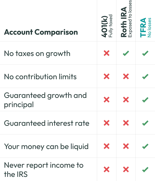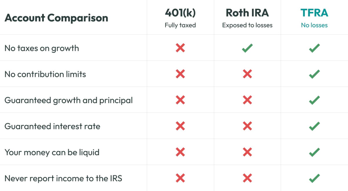 For educational and informational purposes only. Tax-Free Retirement Account (TFRA) does not provide tax, legal, accounting, investment, or financial advice.